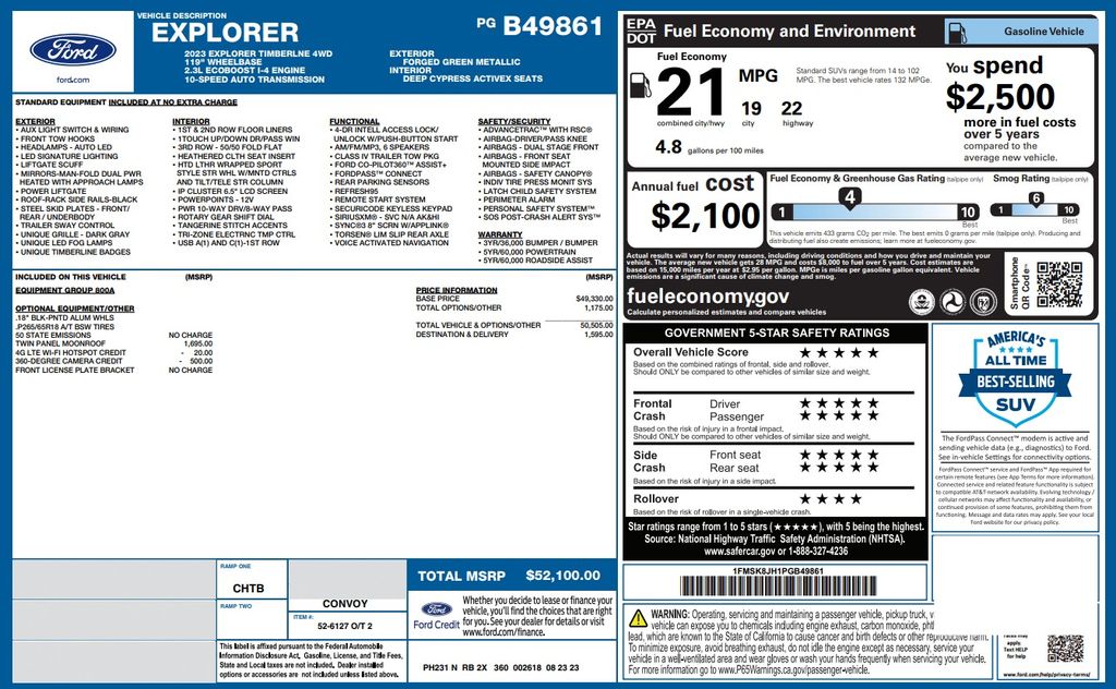 2023 Ford Explorer Timberline (Group 800A) features a 2.3L Eco boost I4 Engine with a 360 Degree Camera ($500 option), 4G Wi-fi Hotspot ($20 option) and Twin Panel Moonroof ($1,695 option)!