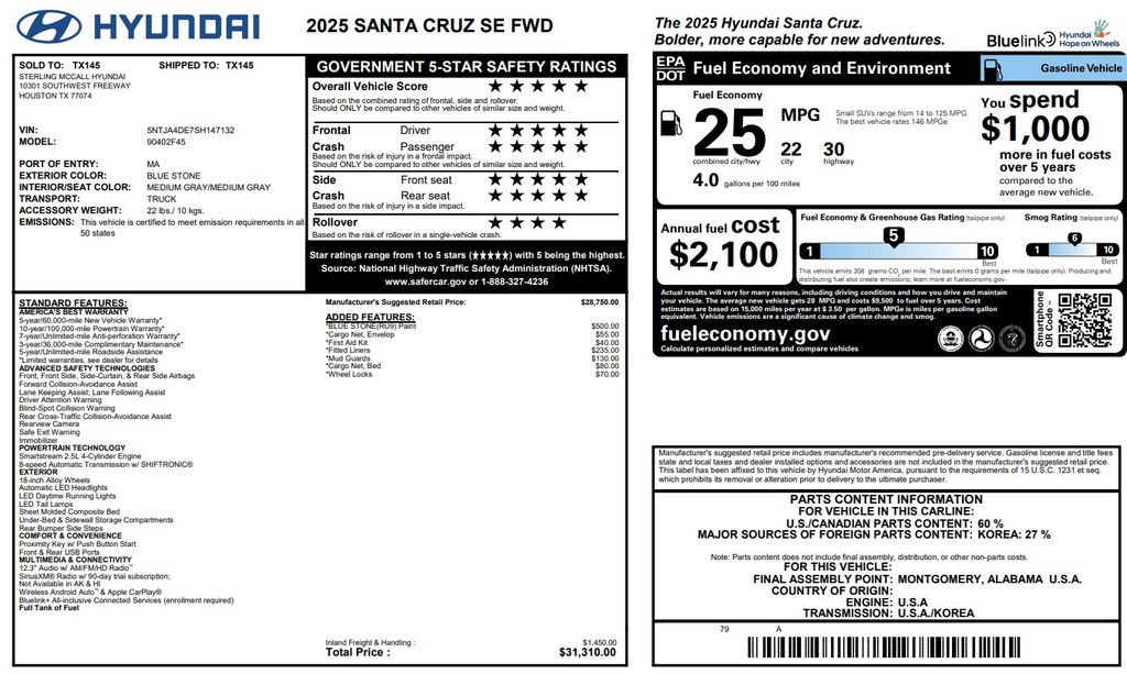 2025 Hyundai Santa Cruz SE features a Smart stream 2.5L 4-Cylinder Engine!