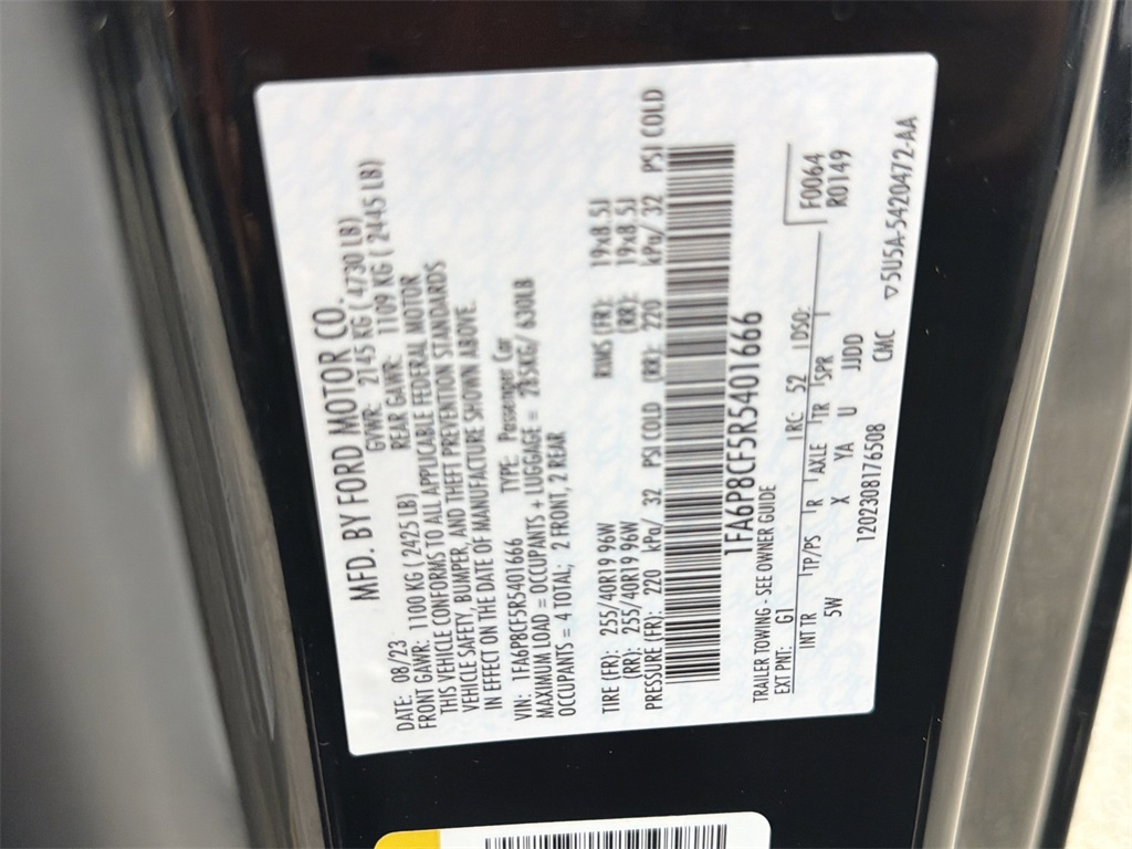 Conditioning, Alloy wheels, AM/FM Stereo, Auto High-beam Headlights, Automatic temperature control, Brake assist, Bumpers: body-color, Compass, Delay-off headlights, Driver door bin, Driver vanity mirror, Dual front impact airbags, Dual front side impact airbags, Electronic Stability Control, Emergency communication system: 911 Assist, Exterior Parking Camera Rear, Four wheel independent suspension, Front anti-roll bar, Front Bucket Seats, Front Center Armrest, Front reading lights, Fully automatic headlights, Illuminated entry, Knee airbag, Leather Shift Knob, Leather steering wheel, Low tire pressure warning, Occupant sensing airbag, Outside temperature display, Overhead airbag, Overhead console, Panic alarm, Passenger door bin, Passenger vanity mirror, Power door mirrors, Power steering, Power windows, Radio data system, Rain sensing wipers, Rear anti-roll bar, Rear Parking Sensors, Rear window defroster, Red Painted Brake Calipers w/White Logo, Remote keyless entry, Speed control, Speed-sensing steering, Speed-Sensitive Wipers, Split folding rear seat, Spoiler, Sport steering wheel, Steering wheel mounted audio controls, SYNC 4.0 QNX, Tachometer, Telescoping steering wheel, Tilt steering wheel, Traction control, Trip computer, Variably intermittent wipers, Voltmeter, and Wheels: 19" x 8.5" Shadow Silver-Painted Aluminum.