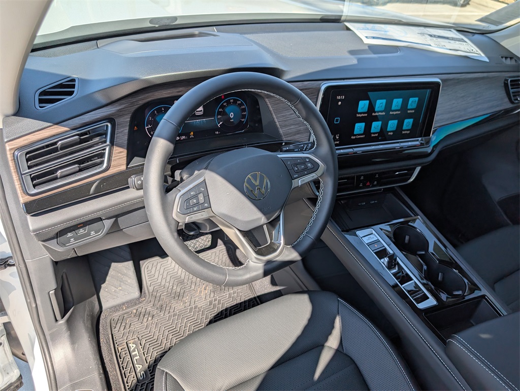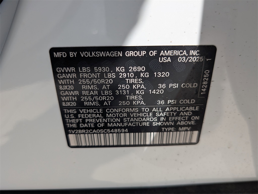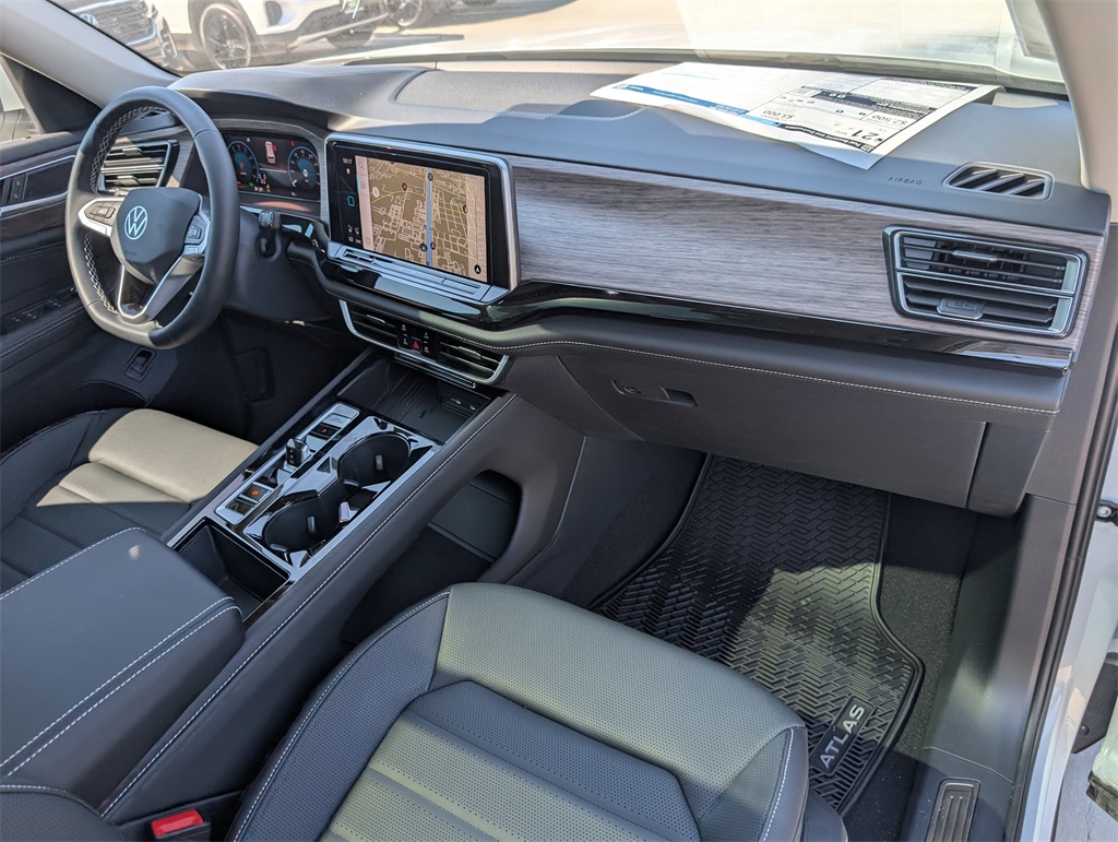or, Compass, Delay-off headlights, Driver door bin, Driver vanity mirror, Dual front impact airbags, Dual front side impact airbags, Electronic Stability Control, Emergency communication system: VW Car-Net Safe & Secure 5-year, Exterior Parking Camera Rear, Four wheel independent suspension, Four-wheel Independent Suspension, Front anti-roll bar, Front Bucket Seats, Front Center Armrest, Front dual zone A/C, Front fog lights, Front reading lights, Fully automatic headlights, Heads-Up Display, Heated & Actively Ventilated Front Bucket Seats, Heated door mirrors, Heated front seats, Heated rear seats, Heated steering wheel, Illuminated entry, Low tire pressure warning, Memory seat, Navigation System, Occupant sensing airbag, Outside temperature display, Overhead airbag, Overhead console, Panic alarm, Passenger door bin, Passenger vanity mirror, Perforated Vienna Leather Seating Surfaces, Power door mirrors, Power driver seat, Power Liftgate, Power moonroof: Panoramic, Power passenger seat, Power steering, Power windows, Radio data system, Radio: MIB3 Discover Media w/Navigation, Rain sensing wipers, Rear air conditioning, Rear anti-roll bar, Rear reading lights, Rear seat center armrest, Rear window defroster, Rear window wiper, Remote keyless entry, Security system, Speed control, Speed-sensing steering, Split folding rear seat, Spoiler, Steering wheel mounted audio controls, Tachometer, Telescoping steering wheel, Tilt steering wheel, Traction control, Trip computer, Turn signal indicator mirrors, Variably intermittent wipers, Ventilated front seats, and Wheels: 20" 2-Tone Machined Alloy. 2025 Volkswagen Atlas 2.0T SEL 4D Sport Utility White 18/25 City/Highway MPG Price includes: $3500 - Retail Customer Bonus. Exp. 01/05/2026