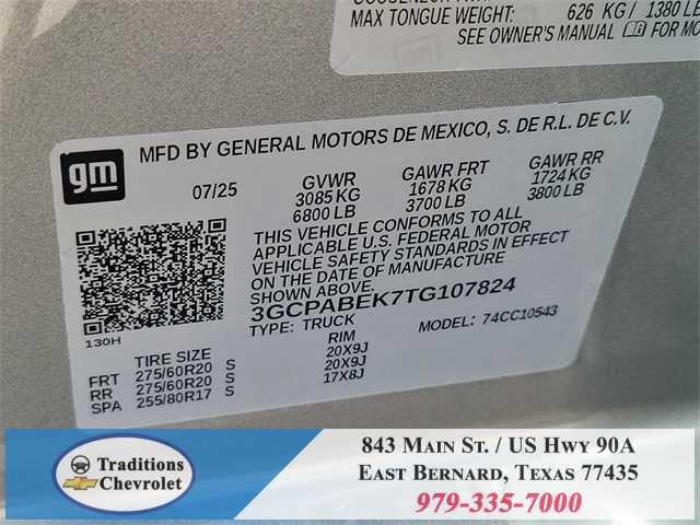 Custom Convenience Package (Electric Rear-Window Defogger, EZ Lift Power Lock & Release Tailgate, LED Cargo Area Lighting, Remote Vehicle Starter System, and Theft Deterrent System (Unauthorized Entry)), Custom Value Package, High Capacity Suspension Package, Preferred Equipment Group 1CX (10-Way Power Driver Seat w/Lumbar, 120-Volt Bed Mounted Power Outlet, 120-Volt Interior Power Outlet, 3.5" Monochromatic Display Driver Info Center, Bluetooth® For Phone, Color-Keyed Carpeting Floor Covering, Deep-Tinted Glass, Dual Rear USB Ports (Charge Only), Electronic Cruise Control, Front Frame-Mounted Black Recovery Hooks, Front Rubberized Vinyl Floor Mats, HD Rear Vision Camera, Manual Tilt Wheel Steering Column, OnStar Services Capable, Power Front Windows w/Driver Express Up/Down, Power Front Windows w/Passenger Express Down, Power Rear Windows w/Express Down, Rear 60/40 Folding Bench Seat (Folds Up), Rear Rubberized-Vinyl Floor Mats, Remote Keyless Entry, SiriusXM Trial Subscription, Standard Tailgate, Teen Driver, Tire Pressure Monitoring System, and Wi-Fi Hot Spot Capable), Trailering Package (Hitch Guidance), 8-Speed Automatic, Black Cloth, 3.42 Rear Axle Ratio, 4-Wheel Disc Brakes, 40/20/40 Front Split-Bench Seat, 6 Speakers, 6-Speaker Audio System, ABS brakes, Air Conditioning, Alloy wheels, AM/FM radio: SiriusXM, Apple CarPlay/Android Auto, Auto High-beam Headlights, Automatic Emergency Braking, Brake assist, Bumpers: body-color, Chevytec Spray-On Black Bedliner, Cloth Seat Trim, Compass, Delay-off headlights, Driver door bin, Driver vanity mirror, Dual front impact airbags, Dual front side impact airbags, Electronic Stability Control, Emergency communication system: OnStar, Following Distance Indicator, Forward Collision Alert, Front anti-roll bar, Front Center Armrest w/Storage, Front License Plate Kit, Front Pedestrian Braking, Front reading lights, Front wheel independent suspension, Fully automatic headlights, Heated door mirrors, Illuminated entry, IntelliBeam Automatic High Beam On/Off, Lane Keep Assist w/Lane Departure Warning, Low tire pressure warning, Multi-Flex Tailgate, Occupant sensing airbag, Outside temperature display, Overhead airbag, Overhead console, Panic alarm, Passenger door bin, Passenger vanity mirror, Power door mirrors, Power driver seat, Power steering, Power windows, Premium audio system: Chevrolet Infotainment 3, Radio data system, Radio: Chevrolet Infotainment 3 System, Rear reading lights, Rear step bumper, Rear window defroster, Remote keyless entry, Security system, Speed control, Speed-sensing steering, Split folding rear seat Tax, title, license and dealer fees (unless itemized above) are extra. Not available with special finance or lease offers. See Dealer for Details. Price includes: $1000 - Bonus Cash. Exp. 12/01/2025 $1750 - Customer Cash. Exp. 12/01/2