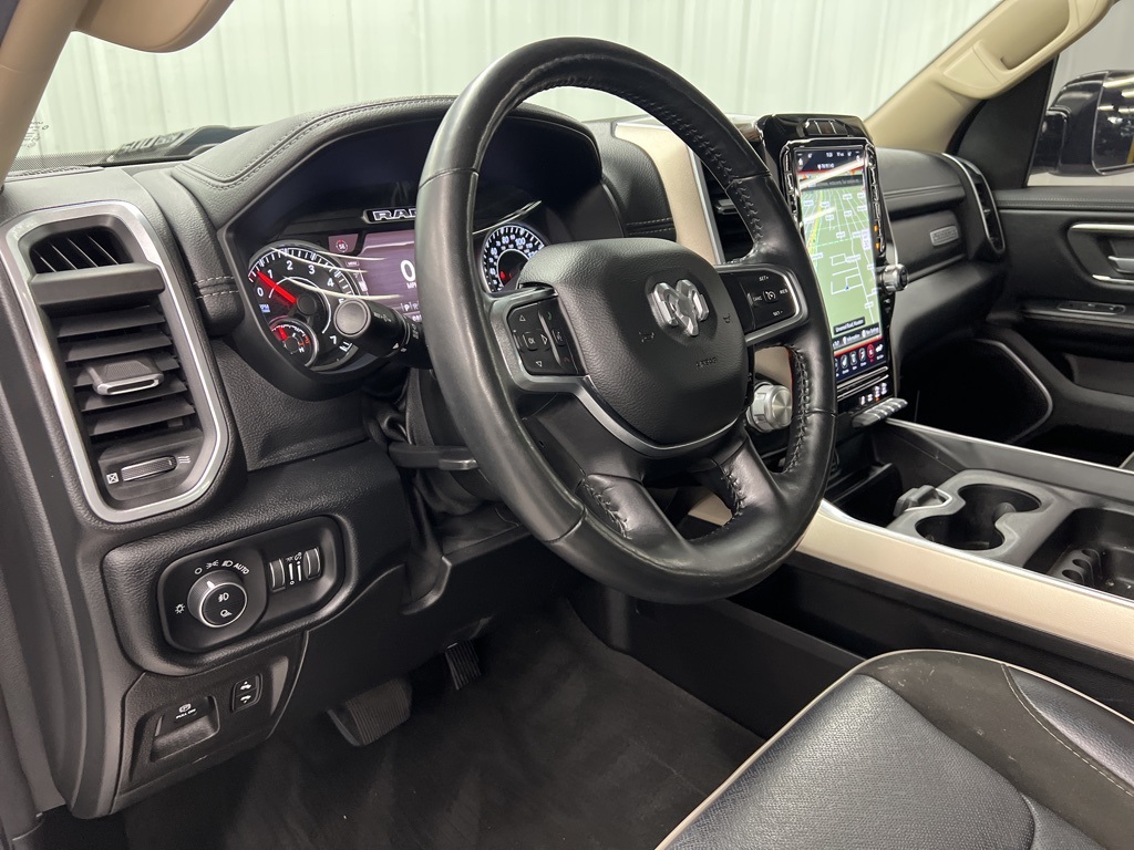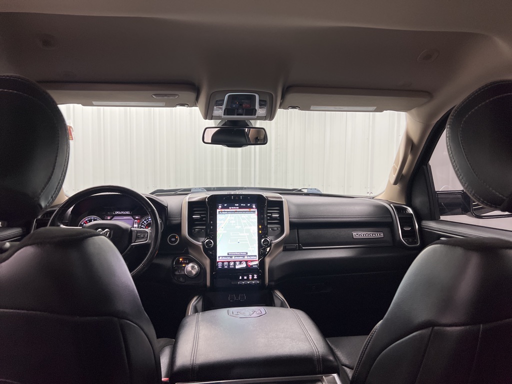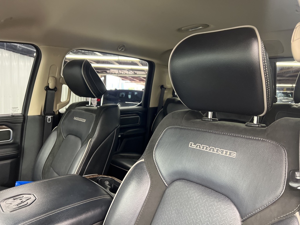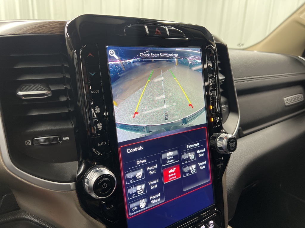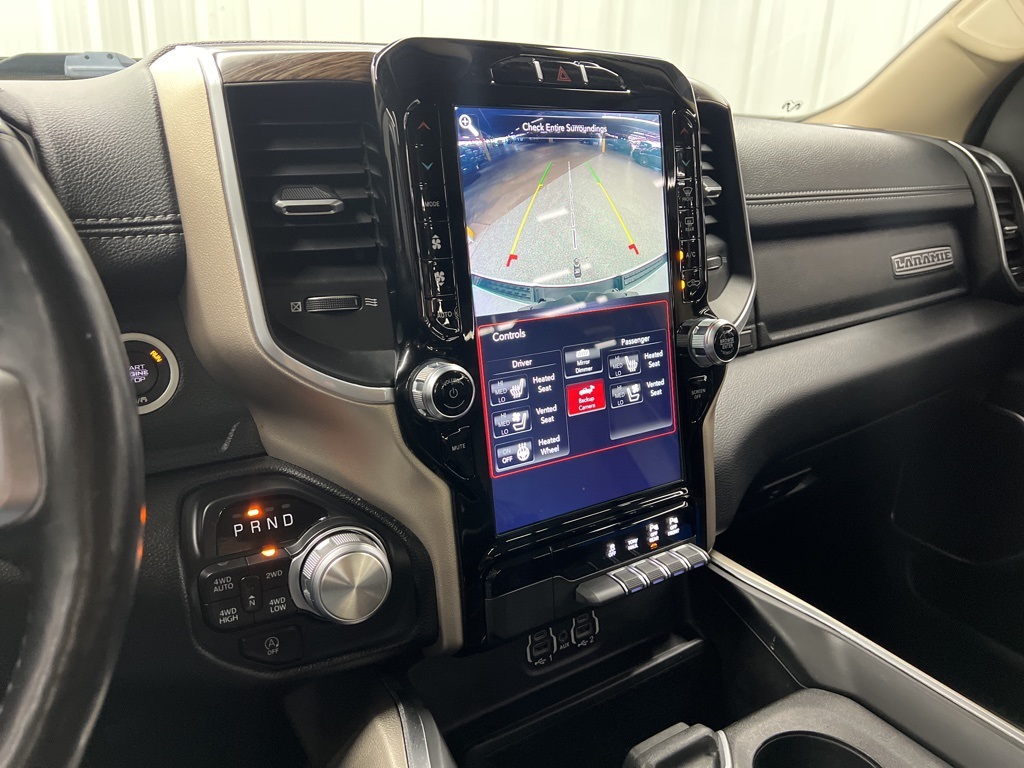 er Package 27H Laramie, #1 Seat Foam Cushion, 1-Yr SiriusXM Guardian Trial, 10 Speakers, 12" Touchscreen Display, 3 Rear Seat Head Restraints, 3.21 Rear Axle Ratio, 4 Way Front Headrests, 4-Wheel Disc Brakes, 48V Belt Starter Generator, 4G LTE Wi-Fi Hot Spot, 5-Year SiriusXM Traffic Service, 5-Year SiriusXM Travel Link Service, 8.4" Touchscreen Display, ABS brakes, Adjustable pedals, Air Conditioning, Alloy wheels, AM/FM radio: SiriusXM, Anti-Spin Differential Rear Axle, Apple CarPlay, Apple CarPlay/Android Auto, Audio memory, Auto-dimming door mirrors, Auto-dimming Rear-View mirror, Automatic temperature control, Brake assist, Bumpers: chrome, Compass, Delay-off headlights, Disassociated Touchscreen Display, Driver door bin, Driver Seat Memory, Driver vanity mirror, Dual front impact airbags, Dual front side impact airbags, Electronic Stability Control, For Details, Visit DriveUconnect.com, Front & Rear Rubber Floor Mats, Front anti-roll bar, Front Center Armrest w/Storage, Front dual zone A/C, Front fog lights, Front reading lights, Front Seat Back Map Pockets, Front wheel independent suspension, Fully automatic headlights, Garage door transmitter, Google Android Auto, GPS Antenna Input, GPS Navigation, HD Radio, Heated door mirrors, Heated Front Seats, Heated front seats, Heated Steering Wheel, Heated steering wheel, Illuminated entry, Integrated Center Stack Radio, Leather steering wheel, Leather Trim 40/20/40 Bench Seat, Low tire pressure warning, Memory seat, Occupant sensing airbag, Outside temperature display, Overhead airbag, Overhead console, Panic alarm, ParkSense Front/Rear Park Assist w/Stop (DISC), ParkView Rear Back-Up Camera, Passenger door bin, Passenger vanity mirror, Pedal memory, Power 4-Way Driver Lumbar Adjust, Power 4-Way Passenger Lumbar Adjust, Power 8-Way Driver & Passenger Seats, Power door mirrors, Power driver seat, Power passenger seat, Power steering, Power windows, Radio data system, Radio: Uconnect 12 w/Navigation, Radio: Uconnect 4 w/8.4" Display, Rear anti-roll bar, Rear seat center armrest, Rear step bumper, Rear window defroster, Remote keyless entry, Security system, SiriusXM Satellite Radio, SiriusXM Traffic Plus, SiriusXM Travel Link, SiriusXM w/360L, Speed control, Split folding rear seat, Steering wheel mounted audio controls, Tachometer, Telescoping steering wheel, Tilt steering wheel, Traction control, Trip computer, Turn signal indicator mirrors, USB Host Flip, Variably intermittent wipers, Ventilated Front Seats, Ventilated front seats, Voltmeter, and Wheels: 18" x 8" Aluminum Base PainteD.