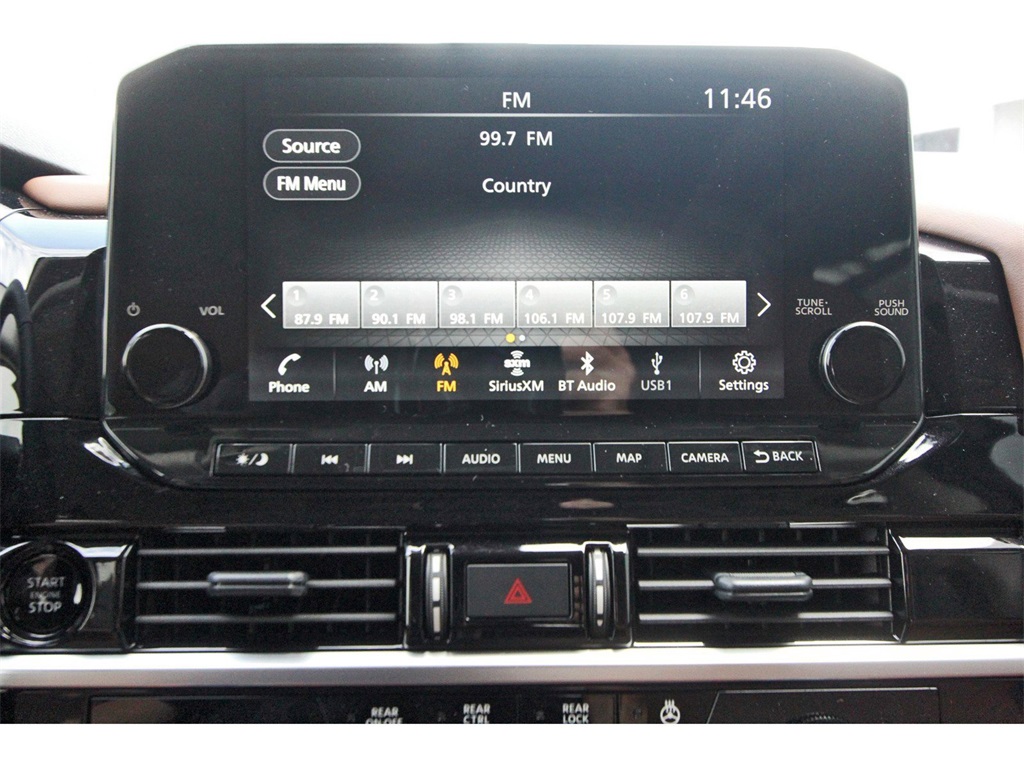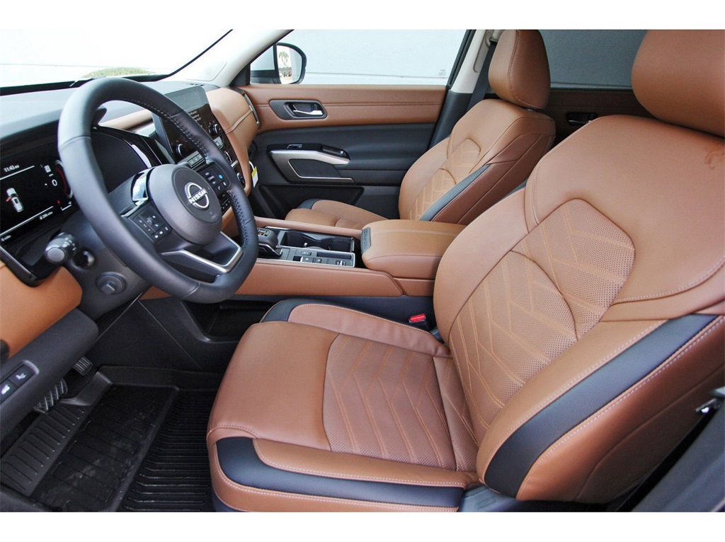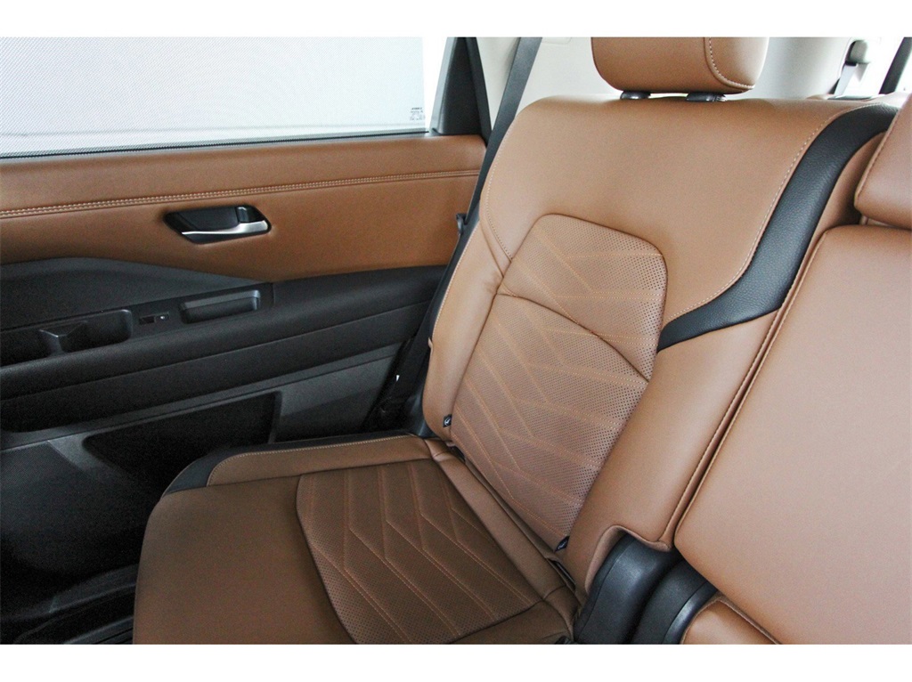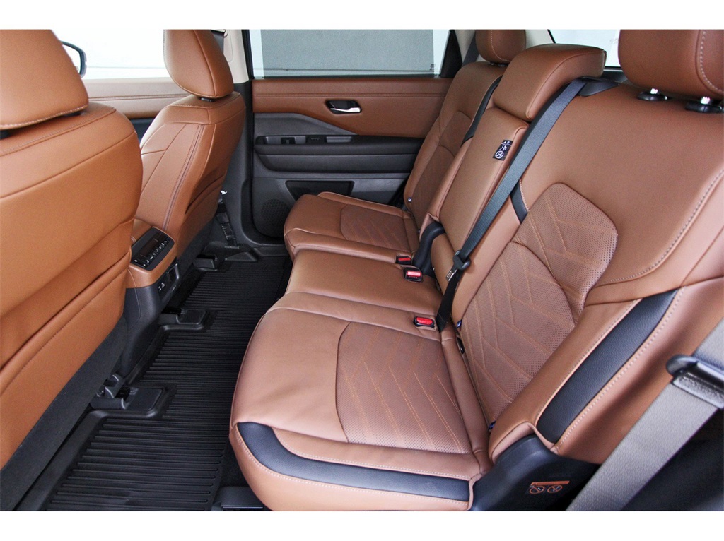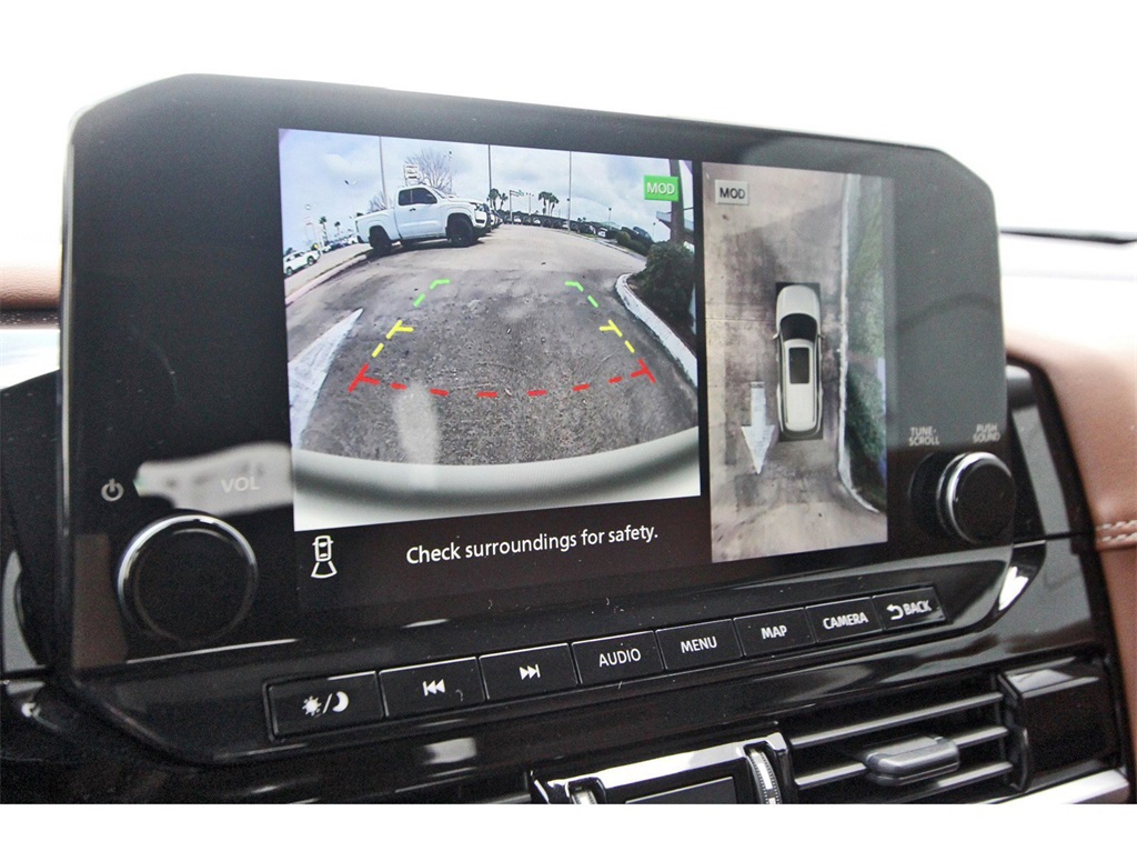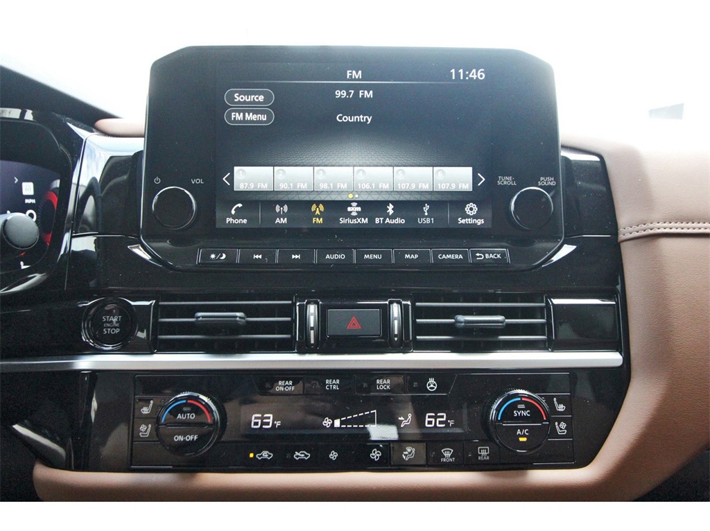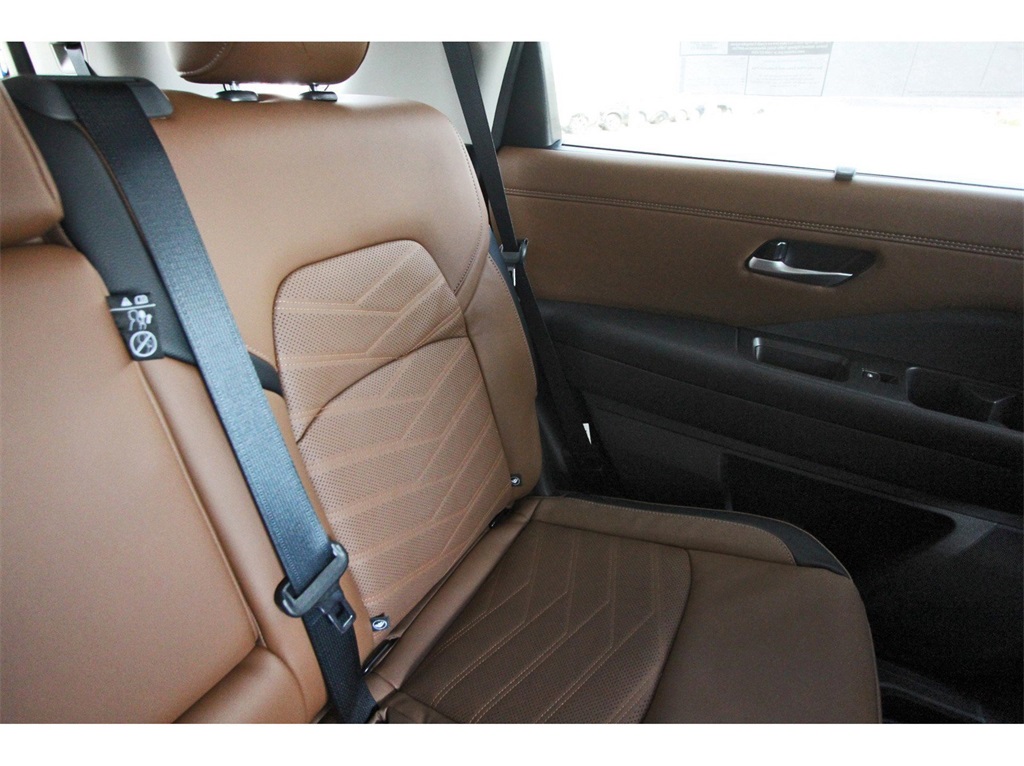 Controlled Front Bucket Seats, Delay-off headlights, Driver door bin, Driver vanity mirror, Dual front impact airbags, Dual front side impact airbags, Electronic Stability Control, Emergency communication system, Exterior Parking Camera Rear, Four wheel independent suspension, Front anti-roll bar, Front Bucket Seats, Front Center Armrest, Front dual zone A/C, Front reading lights, Fully automatic headlights, Garage door transmitter: HomeLink, Heads-Up Display, Heated door mirrors, Heated front seats, Heated rear seats, Heated steering wheel, Illuminated entry, Knee airbag, Leather steering wheel, Low tire pressure warning, Memory seat, Navigation system: NissanConnect with Navigation and Services, NissanConnect featuring Apple CarPlay and Android Auto, NissanConnect w/Navigation & Services, Occupant sensing airbag, Outside temperature display, Overhead airbag, Overhead console, Panic alarm, Passenger door bin, Passenger vanity mirror, Power door mirrors, Power driver seat, Power Liftgate, Power moonroof, Power passenger seat, Power steering, Power windows, Radio data system, Radio: AM/FM Audio System, Rain sensing wipers, Rear air conditioning, Rear anti-roll bar, Rear reading lights, Rear seat center armrest, Rear side impact airbag, Rear window defroster, Rear window wiper, Reclining 3rd row seat, Remote keyless entry, Security system, Semi-Aniline Leather-Appointed Seating Surfaces, Speed control, Speed-sensing steering, Speed-Sensitive Wipers, Split folding rear seat, Spoiler, Steering wheel memory, Steering wheel mounted audio controls, Tachometer, Telescoping steering wheel, Tilt steering wheel, Traction control, Trip computer, Turn signal indicator mirrors, Variably intermittent wipers, Ventilated front seats, and Wheels: 20" x 8J Machined Alloy!!