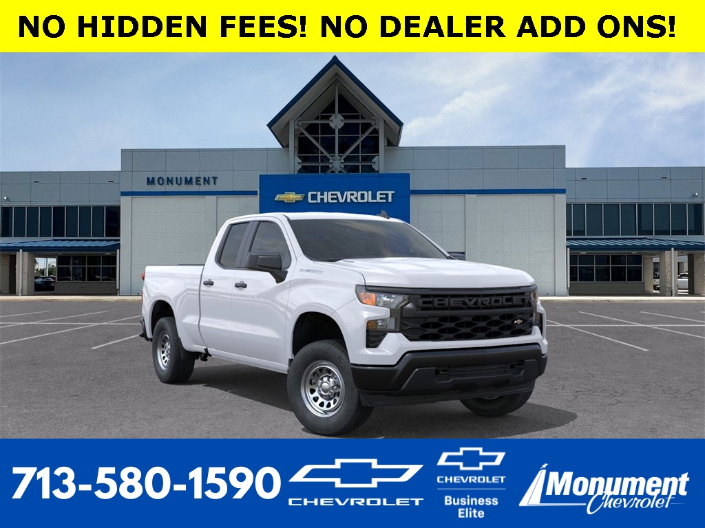 ding on demand, to optimize power delivery and efficiency, WT CONVENIENCE PACKAGE includes (AKO) tinted windows, (C49) rear-window defogger and (DLF) power mirrors, AUTO-LOCKING REAR DIFFERENTIAL, MIRRORS, OUTSIDE HEATED POWER-ADJUSTABLE When (PQA) WT Safety Package is ordered, includes (DP6) high gloss Black mirror caps.), AUDIO SYSTEM, CHEVROLET INFOTAINMENT 3 SYSTEM 7 diagonal HD color touchscreen, AM/FM stereo, Bluetooth® audio streaming for 2 active devices, voice command pass-through to phone, Wireless Apple CarPlay® and Wireless Android Auto® compatibility (STD), TRANSMISSION, 10-SPEED AUTOMATIC, ELECTRONICALLY CONTROLLED with overdrive and tow/haul mode. Includes Cruise Grade Braking and Powertrain Grade Braking. Chevrolet Work Truck with Summit White exterior and Jet Black interior features a 8 Cylinder Engine with 310 HP at 5600 RPM*.