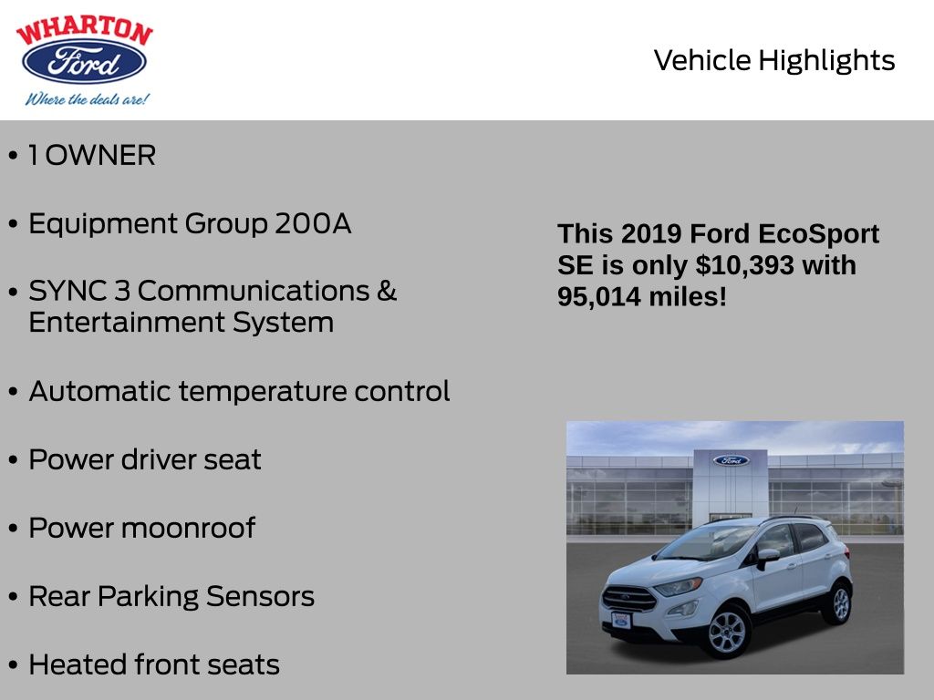 Certified. Diamond White 2019 Ford EcoSport SE FWD 6-Speed Automatic EcoBoost 1.0L I3 GTDi DOHC Turbocharged VCT 1 OWNER, Alloy wheels, Automatic temperature control, Equipment Group 200A, Heated front seats, Power driver seat, Power moonroof, Rear Parking Sensors, SYNC 3 Communications & Entertainment System, Wheels: 16" Shadow Silver-Painted Aluminum.